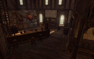 Inside, The Blushing Mermaid has a single split-levelled hall with a bar counter near the entrance, and the area for clientele on the upper level. Part of the upper level is separated by curtains, forming a makeshift captain's stateroom. The tavern has a basement as well, which serves as storage. A carved wooden statue of a mermaid hangs above the main bar, its tail painted to resemble rosy flush.