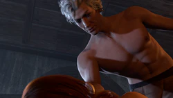 | “ | Astarion clutches the player character's neck in his hand and grins, squeezing before biting them. Astarion's right hand shoots up quickly, grabbing the player character's neck. Locking eyes with them, he starts to squeeze their neck; the player character squirms a bit, gasping for breath. They're enjoying it. Astarion then releases the player character's neck, leaning over to bare his fangs and bite into the player character's neck. After a while, he stops and raises his head. (Note: Astarion is still on top of the player character, his body shifted slightly to the side (the player character's right) so he has room to take their neck and do all the bloodsucking). |