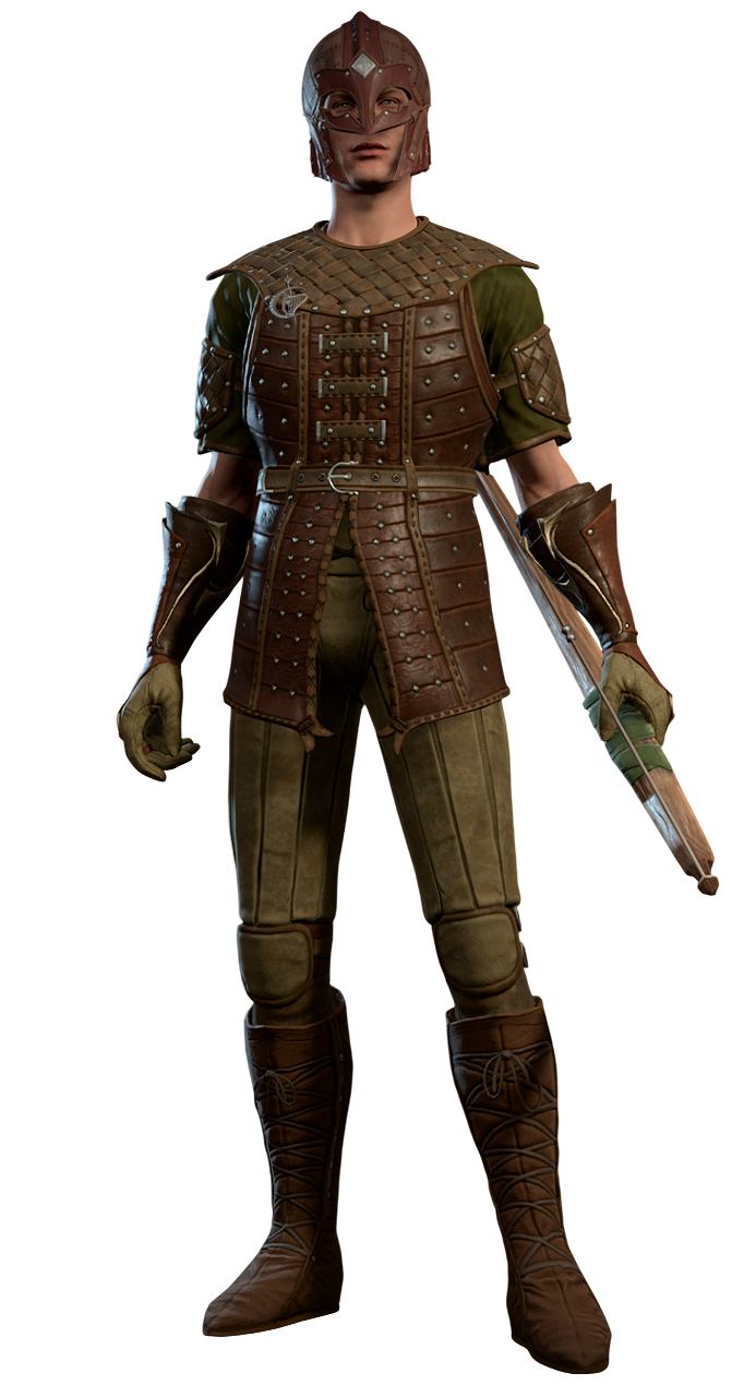 - ↑ Unlike other Harpers, Blaird and the nearby Harpers do not conform to their organization's brown and blue colour patterns. Instead, Glist and Blaird wear armour identical in appearance to Studded Leather Armour in green and tan colours, and a Red Carmine Mask.