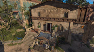 The basement hallway is crossed by several tripwires and Vents armed with Cloudkill. The farmost part of the storage area is used by The Glitter Gala.