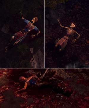 - There are two corpses in the cave underneath the Skeleton near the magic ring that can be found in the area. Based on the outfits, one may be a reference to Lara Croft (X: 1566 Y: 1503), the other Indiana Jones (X: 1570 Y: 1508).