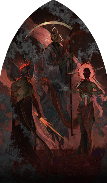 Before they were gods, , and were once mortal men who dreamt of godhood. They set out into the world, amassing power and defeating all who opposed them. Once they had gathered enough power, they set their sights on Jergal , the ancient God of Death, whose power they coveted the most. They stormed Jergal's realm and confronted him at his throne. However, they were taken aback by Jergal's willingness to step aside as the Lord of the End had grown tired of his power and station. Jergal proposed a game of chance to the Three so they could equally divide his power amongst themselves without killing each other for it.