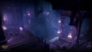 Past the training rooms, a massive cavern starts. In its middle, a long path leads to the main chamber of the cloister. There Mother Superior Viconia DeVir and the rest of the Sharrans wait for the party. When they approach, the dialogue with Viconia starts automatically. Its layout depends on whether Shadowheart is present and, if she is, her chosen path (see Companion Interactions section below).