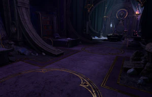 The library on the opposite side of the main chamber features numerous books and documents describing Sharran doctrine. At X: -396 Y: -1672, behind the column, is a locked opulent chest with gold, random valuables and arrows inside. It requires DC 20 Sleight of Hand Check to lockpick.