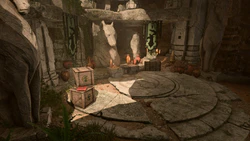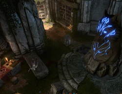- ↑ There is no such location on the in-game map. The area beyond the stone door is marked as Emerald Grove. "Inner Sanctum" is a term used by the wiki to help disambiguate.