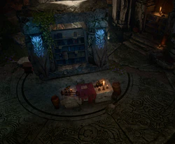 To the northwest of the central cavern lies a smaller room divided by a movable stone door at X: -464 Y: -13. It features several rows of Stone Tablets and a primitive desk made from a stone slab with the Rite of Thorns scroll and The Emerald Enclave: Tenets on it. All containers and lootable items (except the rite scroll) in this area are red-outlined. One of the druids, Marcoryl, checks around this room from time to time, accompanied by Silver. However, any means of stealth or concealment, such as the spells Fog Cloud or Darkness, can be enough to evade their notice.