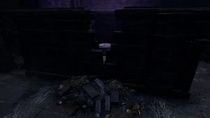 The corridor that opens into the trials' hall starts at X: -758 Y: -783 between two stairs leading to Balthazar's outpost. To the left of the hall are the doors to the Soft-Step Trial and to the Self-Same Trial. At the far end of the hall is a spiral staircase which leads down to the lower lever of the Gauntlet, where Faith-Leap Trial and the Silent Library are located. The lower level can also be reached by using the lift mentioned above. However, the lever that calls the lift up is broken, and to use it for descending, the party must first find the missing handle and insert it into the mechanism. A texture bug has been reported multiple times, resulting in the death of party members while using the lift. It is recommended to ungroup the party members, move them individually onto the platform of the lift and make sure they do not stand on the edge of the platform.