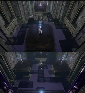 The dialogue is interrupted by the Gauntlet's ghostly defenders, Dark Justiciars, who immediately attack the group. They are constantly summoned through several Umbral Tremors appearing around, until the tremors are destroyed - or a number of Justiciars are. The skeletal undead fight along the party as neutrals against the Dark Justiciars. After the fight, the party can proceed down the stairs and up the another one to get to the vast antechamber abutting Balthazar's room. Along the first staircase is a lift which descends to the lower part of the temple, and also a Waypoint. Between the two stairs starts a north-leading hall which opens into the Trials of Shar chambers (see below).