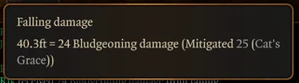 When jumping from a height great enough to deal damage, a tooltip will display the damage the creature will suffer if they jump to the targeted location. If the damage would be sufficient to kill the creature the text "Dead" will be displayed instead. This tooltip will accurately show the reduced damage from resistance to falling damage but will still incorrectly show the full damage amount for creatures resistant to bludgeoning damage. Any additional damage from displace or other effects will never be included in this tooltip, nor will flat damage reduction from features like Heavy Armour Master. This tooltip will always suggest that a creature may be knocked prone by the fall, even if the fall is not high enough.