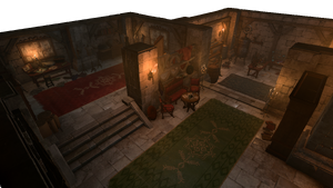 Following the stairs up from the side room next to the entrance leads to a locked door, opened with a DC 20 Sleight of Hand check. Through the door are two more rooms. The first serves as a hall and contains mostly miscellaneous loot, including a Potion of Superior Healing inside a wicker chest. The second room can be entered from the hall and is Figaro's bedroom. In this room is an empty strongbox in the wall which can be opened with Figaro's Safe Key. On a desk in the bedroom another key can be found. Next to these rooms, a large balcony can be reached from the hall.