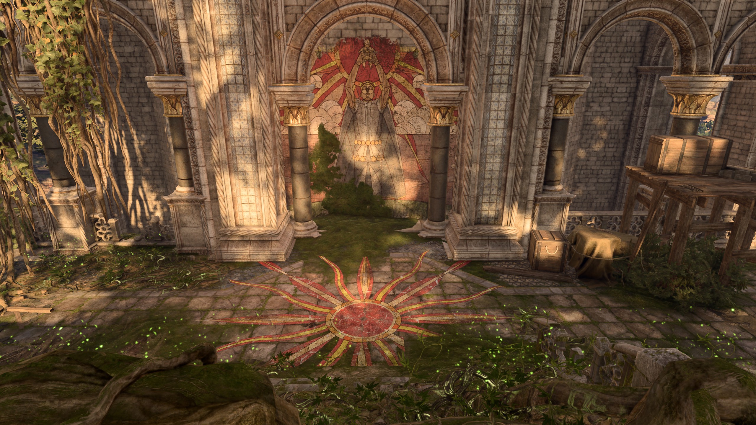 Screenshot of A Mural of Lathander and his Holy Symbol. Found next to the Eagle's Nest on the rooftops of Rosymorn Monastery.