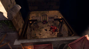 To get to the torso's location, the party should use a hatch in the kitchen at X: -62 Y: 3. There are pools of blood which can be followed to the actual murder site. However, bloody puddles abruptly stop in front of what appears to be a solid stone wall.