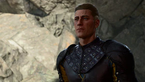 The two Zhentarim guards are trapped in a cave near the Risen Road, surrounded by Gnolls. Rugan and Olly's reaction varies depending on how the party encounters them. If the party enter the cave from the back entrance at X: 50 Y: 576, then Rugan remarks that they are just as trapped as him and Olly and they all need to band together to fight. If the party enter from the front at X: 38 Y: 618, Rugan tells Olly to stand down and leave the heroics to those who don't value their own skin.