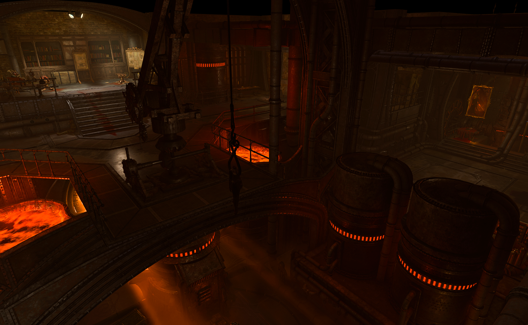 The elevator opens to the conveyor belt running through southern half of this level from what appears to be a forge, with several Steel Watcher torsos on it. The door from the Security office leads to the landing of a small staircase in northern half of the hall. The landing extends to a narrow balcony at X: -1969 Y: 420, from which a character with enough Strength can jump up to the pipes winding under the ceiling. These pipes allow to reach most parts of the Lab Level and can be useful in a fight. Using means of spatial movement like Misty Step or Grant Flight is helpful to reach them as well.