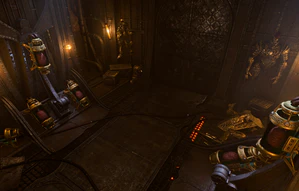 When entering the foundry from the main entrance, the party found themselves in a small antechamber, assumingly meant for routine maintenance of the automatons. To the right from the entrance Gasper Throaks and Iron Consul Chadd are talking. Their sight cones lie far from the doors.