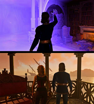 3. Through the cutscene, Gale proposes using one of his magical tomes as a guide. Despite being described by him as a story "of a first thousand nights of a newlywed king and queen", the book is titled simply as "Illusion" (written in Thorass alphabet). The inscription on the page Gale opens is also in Thorass and can be translated into a Latin phrase "In Pulvinar Vox", meaning "A Voice on the Pillow".