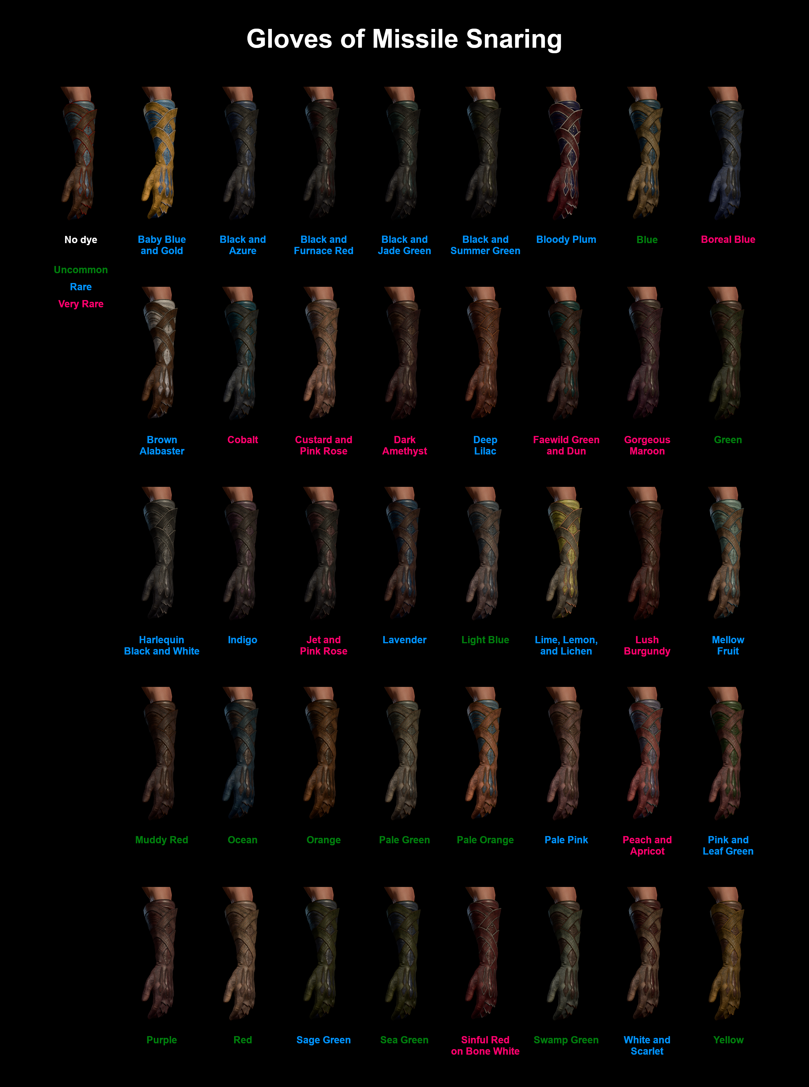 Gloves of Missile Snaring is a rare pair of gloves that allows the wearer to use Missile Snaring to reduce incoming ranged damage as a Reaction.