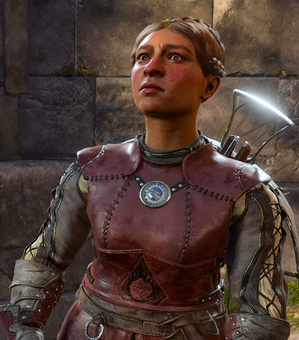 Fist Gneiss is a dwarven ranger and a member of the Flaming Fist. She can be found in the streets of Lower City in Act Three.