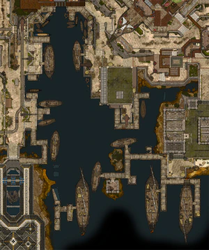 The dock pier can be found at X: -208 Y: -188. Upon visiting the docks for the first time, the party can find a citizen named Dharin Brislen, arguing with Captain Sleam over smuggling his family of four out of the city. Unfortunately, the family is short of money, only being able to pay for three. The party can help the family by convincing Captain Sleam to take them all or by paying her the sum the Brislens are lacking. Helping the family by any means grants approval from some companions.