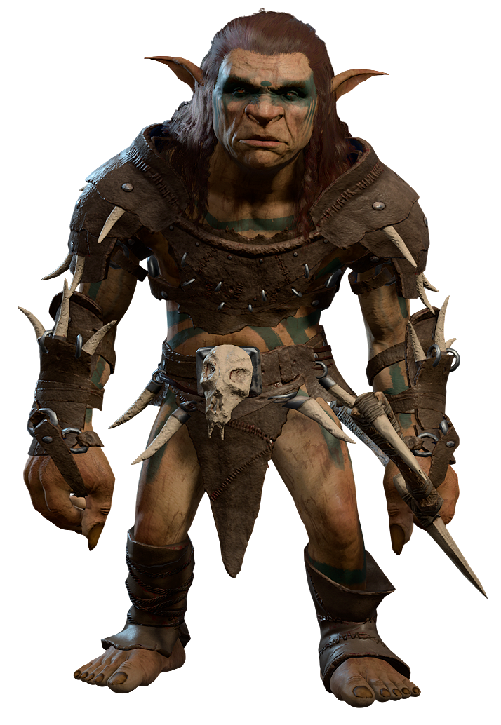 Tracker Grikka roams between the roast spit and booze tub in the main outdoor area of the Goblin Camp. If the party initiate conversation, Grikka explains that the dwarf being roasted was part of the adventuring party with Halsin and that the goblins now possess a warbear and a prisoner, who is being tortured for information.