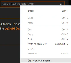 - From any bg3.wiki page (including this one), right-click on the Search Baldur's Gate 3 Wiki box in the top right corner of the page and select Create search engine...