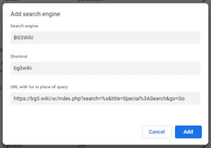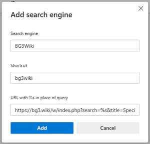Here are browser-specific instructions on how to define a custom search keyword, which you can type in your address bar to focus your search directly on bg3.wiki.