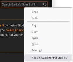 - From any bg3.wiki page (including this one), right-click on the Search Baldur's Gate 3 Wiki box in the top right corner of the page and select Add a Keyword for this Search.