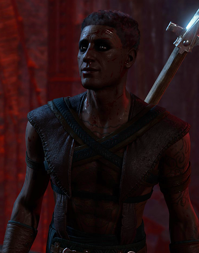Initially he accompanies Orin the Red on the central altar ground, trying to distract her from torturing the victim she abducted from the campsite.