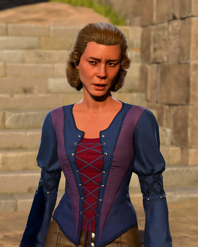 Hyrla Sname is a human civilian who can be found near Bonecloak's Apothecary in Baldur's Gate during Act Three.