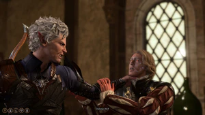 If Astarion is present, choosing him to start the dialogue with the charmed guards results in them reacting peacefully to the party. They are astonished at seeing Astarion outside the palace on the cusp of the ceremony's beginning, and hurry him to participate.