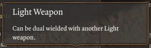 Light is a weapon property that allows characters to dual wield weapons, that is, equip one Light weapon in their main hand and one Light weapon in their off-hand.
