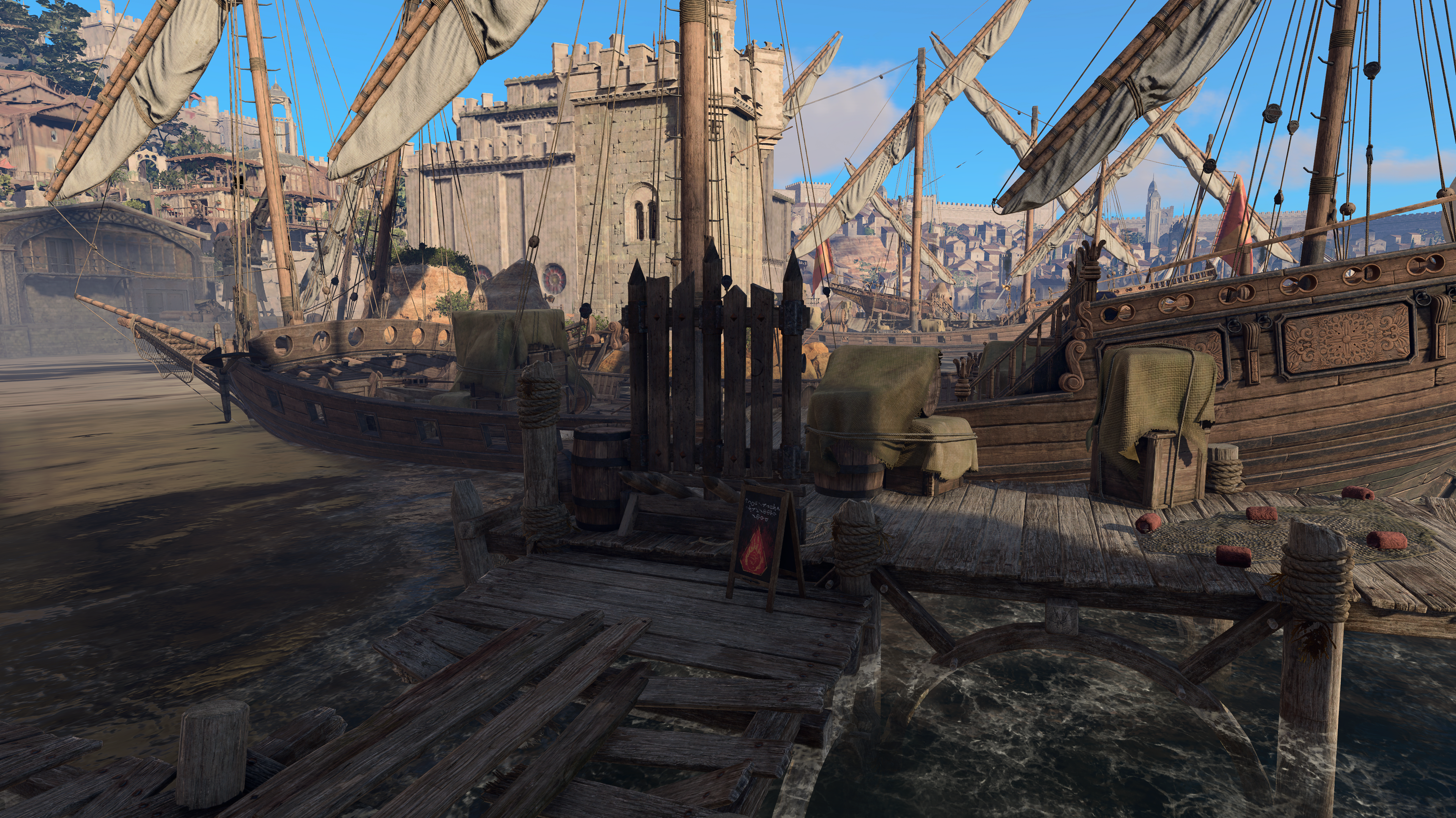 - Via the docks next to the Water Queen's House, this requires traversing across sinking docks and the dock at which the Lass is located is blocked off by a barricade.