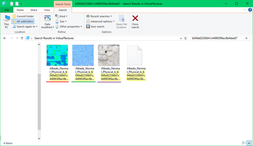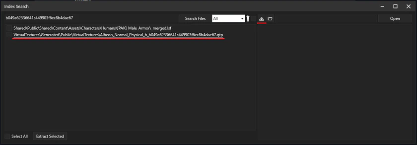 Now that you have your GTexFileName, you can extract the textures from VT. Search your GTexFileName (in this case: b049a62336641c449903f6ec8b4dae67) in the multitool. Select the file that's inside VirtualTextures and click on the Extract file icon.