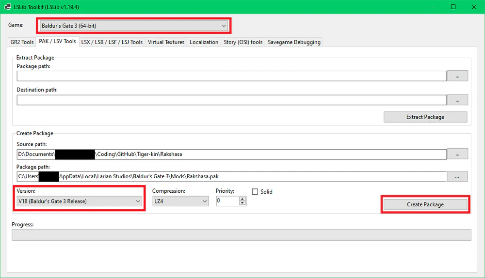 - In the PAK / LSV Tools tab, focus on the Create Package section.