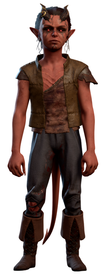 Mol is the leader of group of young tiefling refugees, who, along with their elders, are trying to reach Baldur's Gate after being expelled from Elturel. Comprised mostly of civilians and children, and with goblins currently blocking the road, the tieflings have taken refuge at the Emerald Grove.