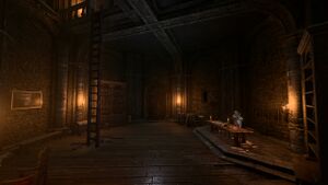 The second floor is free to climb up using an iron ladder. Upstairs, yet another Scrying Eye moves back and forth, never leaving this small room. Here the player character can find Wulbren's Hammer (on a table near the window) and Browbeaten Circlet (in a locked Evidence chest at X: Y: ). Two more locked chests contains some gold, valuables and alchemical ingredients. Also, some valuables can be taken from the desk here. However, if the Warden is at her office downstairs, any attempt to take something red-outlined in this room causes her to immediately proceed upstairs to investigate, regardless of the Scrying Eye's watching cone direction.