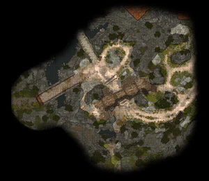 The Mountain Pass location is a small area adjacent to the Waukeen's Rest environs, actually being an extension of the Risen Road. The party can access it from the Risen Road approximately at X: -86 Y: 550, where several paths running from the inn and along the river shore collide. At the crossroads leading further along the Risen Road a wooden ramparts stands. The party can choose to walk under the rampart archway, cross it atop and descend from the other (western) side, or climb down the cragged rock to its east.