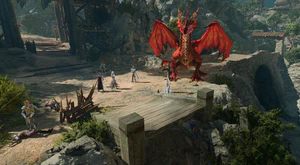 When coming close to the chokepoint, a cutscene is triggered where the githyanki patrol confronts a squad of the Flaming Fist mercenaries. A fight seems inevitable, but the patrol receives a reinforcement: a githyanki knight on a red dragon. The dragon eliminates the Fists in an instant with fire breathing stroke, destroying the wooden bridge over the river stream in the process.