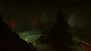 A series of cliffs south of the chamber serve as an exit. They leads to an area where a pair of Hook Horrors stand between the party the Cragged Rock leading out.