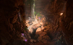 In the middle of the cave, right before the owlbear den, the ground steeps up to the west, eventually leading to a rocky shelf above the den. The shelf is divided in two in the narrowest place, so that exploring the farmost part requires a jump. Several fissured stalactites hanging from the shelf can be shot down to damage whatever stands under them.