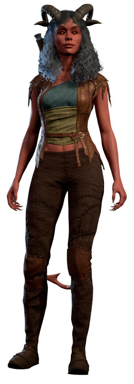 Pandirna is one of the tiefling refugees seeking shelter at the Emerald Grove in Act One. With her legs paralysed from a dodgy brew, she is given the duty to guard the refugees' storage hut.