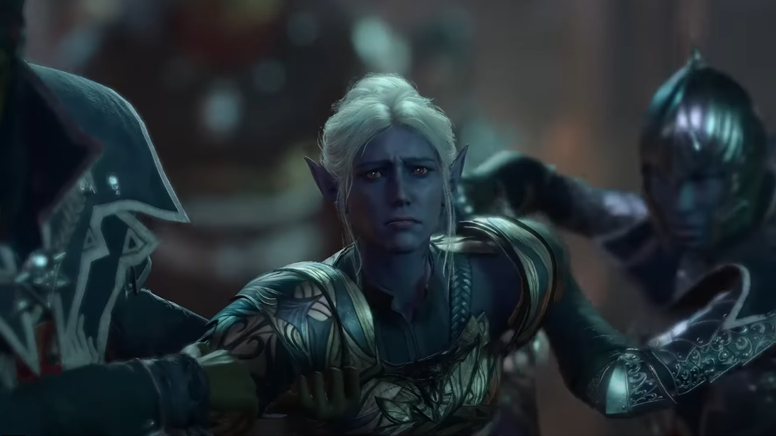 Free Lae'zel We found Lae'zel, the githyanki from the nautiloid, trapped in a hanging cage. Two tieflings are deciding what to do with her.