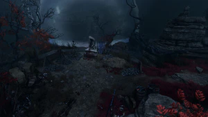 To the north, the path leads out of the pit to the small patch of land. From it, the party can climb up several rocky cliffs westward to reach the Grand Mausoleum, or descend further to the rivershore with the dilapidated fisher's hut.