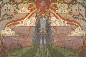 This chamber features a large picture of stained glass on the floor and four altars around it. A Ceremonial Longsword already lies on one of the altars, radiating a bright light. The altars are actually components of a riddle that the party may solve. To do so, they should obtain "Ceremonial" weapons of the other three types, and interact with the stained glass, no matter the order. Three parts of the picture are intact, while the fourth is broken. The glass panel depicts four Dawnmasters of the Rosymorn Monastery, each wielding their favourite weapon: