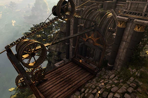 Heading to the east from this crossroads, the party come to a high cliff with the aerial ropeway station at X: -44 Y: -74. The Cable Car, however, is at the lowest point of the route. To use the mechanism, the party must first unblock the Cable Car Wheel nearby (which requires a DC 15 Strength Check and allows a single try for each party member). If repaired, the cable car can be used to travel to the landing ground just west of the Rosymorn Monastery at X: -10 Y: 6. With the upper wheel unblocked, the lower wheel also becomes operational.