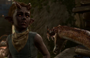 The druids at the gate initially try to stop the party but, unless attacked or ignored repeatedly, soon relent and let them through. Upon entering the Druid's Chambers, Arabella can be found standing in judgement in front of Kagha. Also present are some other druids and Kagha's restless, venomous snake Teela. The party can watch and do nothing, in which case Teela bites and kills Arabella. If choosing to attack, a large-scale fight begins between the druids and the tieflings in the whole grove, where the druid Rath then fights on the side of the tieflings.