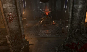 Dror Ragzlin's throne room lies at the north side of the temple. It has a wooden dais where Ragzlin's throne stands, and an upper gallery along the far wall of the room. Two iron ladders at both sides of the gallery lead to shadowed rafters, which allow for high-ground ambushing.
