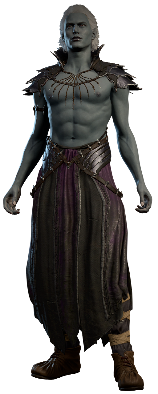 Sorn Orlith is a Seldarine Drow sex worker employed at Sharess' Caress, where he works alongside his twin sister, Nym Orlith.