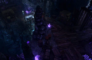 The Storehouse is divided from the other parts of the Underdark by the rope netting. The ground at the foot of the netting is trapped with several hidden Blast Mines, which can be noticed with a passive perception check. Triggering any of them starts a chain explosion that may eventually destroy the netting and alerts nearby Minotaurs. However, it is possible to climb up or descent through a series of jumps onto rocky steps and giant mushroom caps just aside.