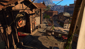 The only entrance into the tavern is from its "deck" at X: -142 Y: -98, which continues into wooden terraces lining the building from both sides.
